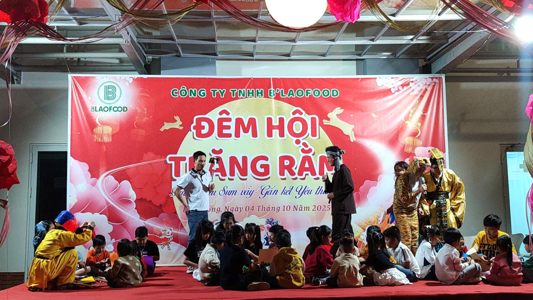 Hòa trong không khí rộn ràng của Tết Trung thu – ngày hội của thiếu nhi Việt Nam, tối ngày 04/10/2025, Công ty TNHH B'Laofood đã tổ chức chương trình “Đêm Hội Trăng Rằm 2025” dành cho con em cán bộ công nhân viên tại khuôn viên công ty. Đây là hoạt động thường niên mang đậm ý nghĩa nhân văn, thể hiện sự quan tâm sâu sắc của Ban Lãnh đạo công ty đối với đời sống tinh thần của đội ngũ CBCNV và gia đình họ.
