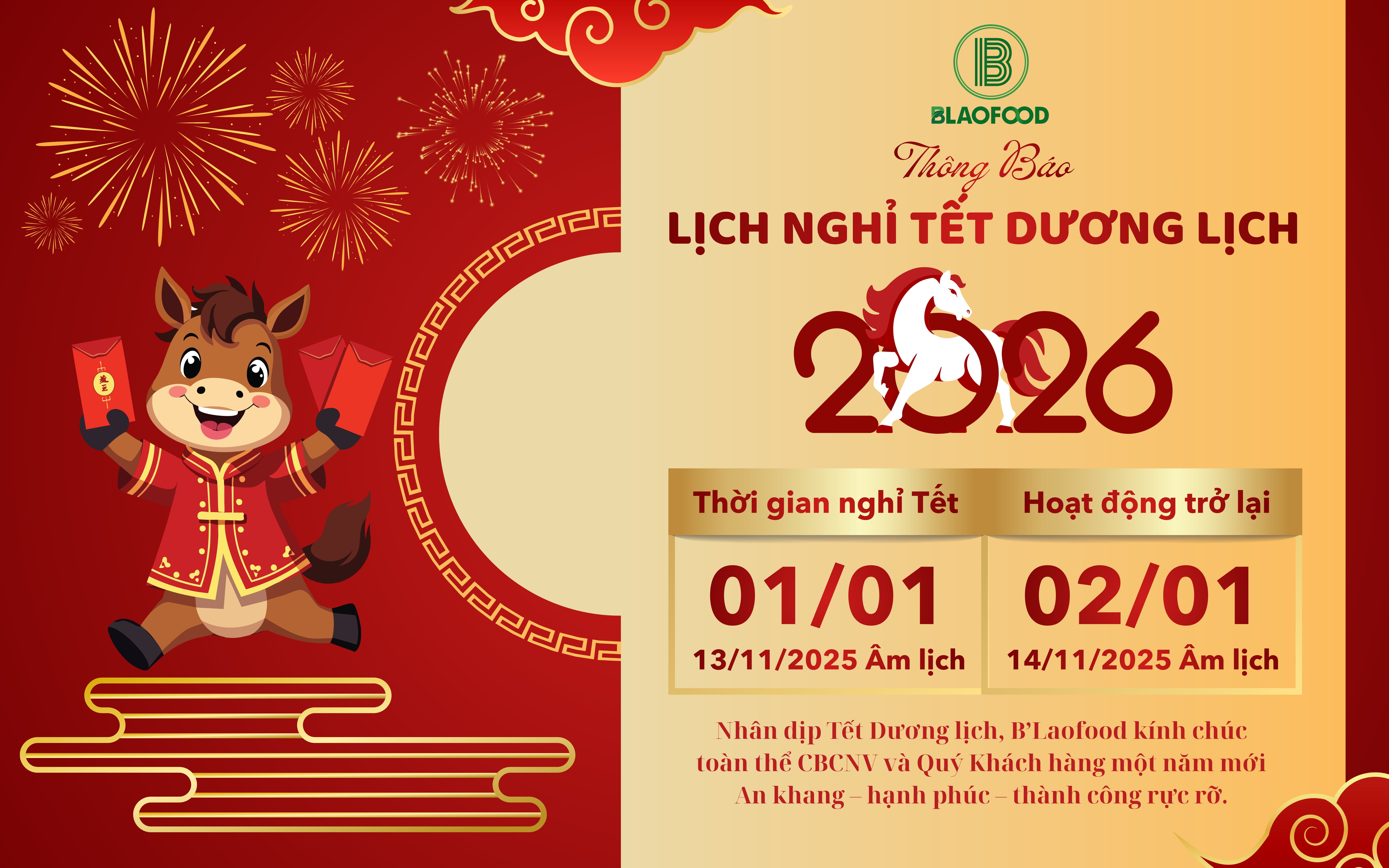 Công ty TNHH B’Laofood trân trọng thông báo đến Quý Khách hàng, Quý Đối tác và toàn thể Cán bộ Công nhân viên lịch nghỉ Tết Dương lịch như sau: